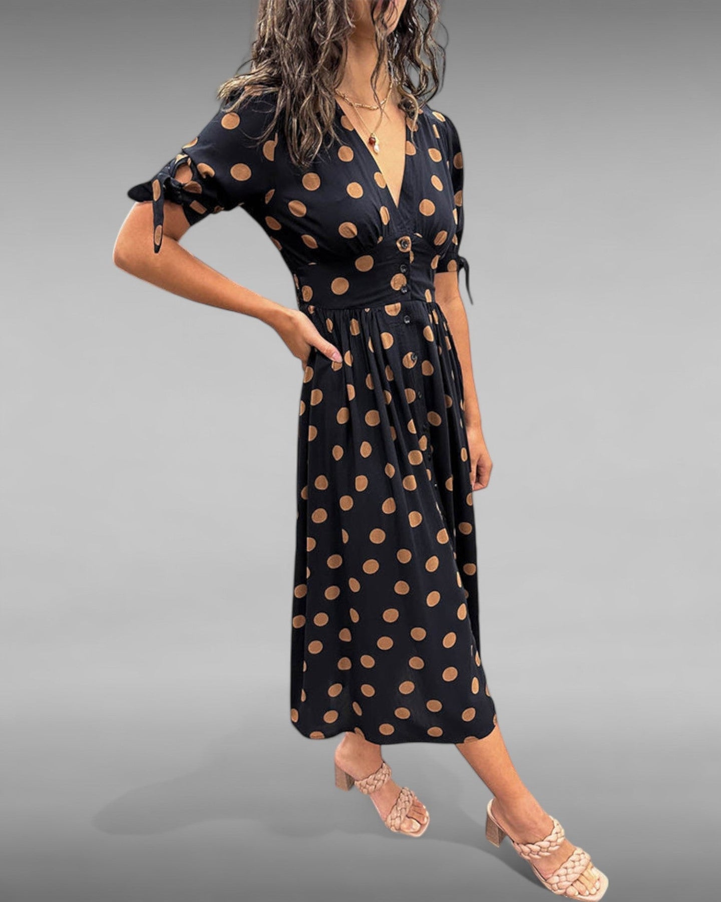 Its brown polka-dot print on a black background is soft, graphic, and timeless.