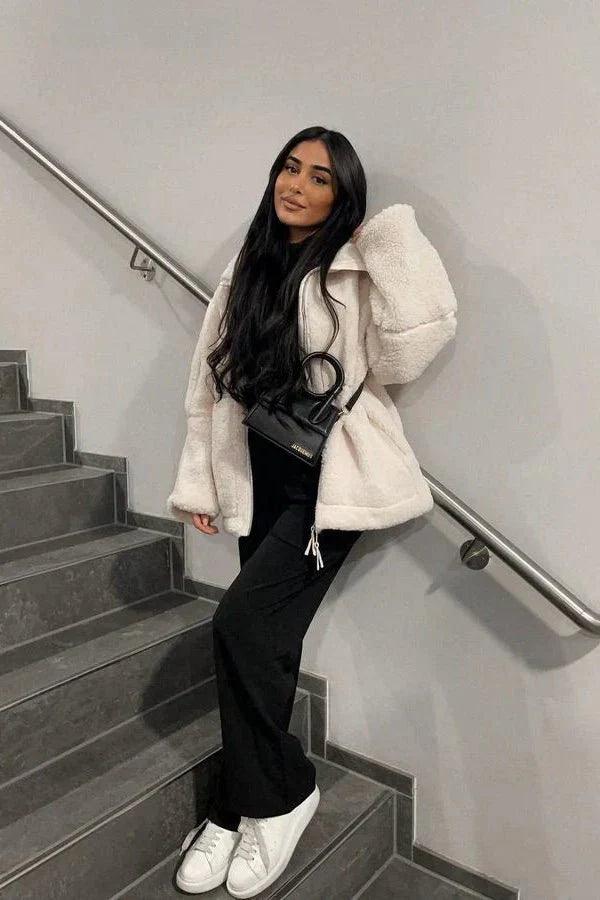 The soft teddy fleece envelops the body and provides an exclusive feel on cool days, while the mid-length silhouette and standing collar exude modern refinement.