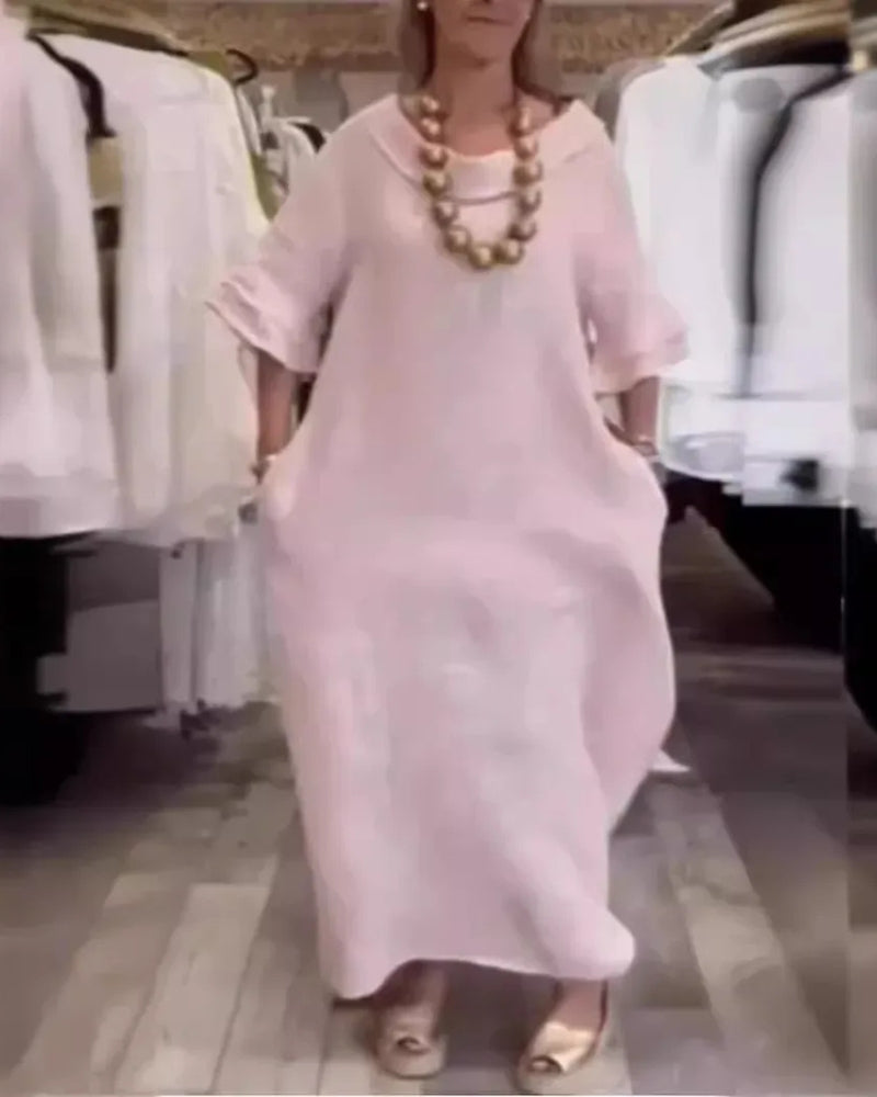 Designed with a round neck and flared sleeves, this long dress with a side slit offers a fresh, comfortable, yet sophisticated look.